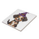 The image shows a cartoon of a seemingly happy dog wearing a witch's hat and a leash with a label in the form of a heart. This illustration may be significant or relevant for themes like Halloween, pet animals dressed or cartoons of animals. The image displays a cartoon of an apparently happy dog adorned with a witch's hat and wearing a collar that features a heart-shaped tag. This illustration could be significant or pertinent for topics such as Halloween, pets dressed up in customs, or celebratory animal drawings.