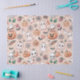 A sweet and playful seamless Halloween pattern tissue paper set on a light orange background with white stars, featuring adorable white ghosts with rosy cheeks, smiling pink and orange pumpkins, and charming seasonal accents like spiderwebs, bows, candies, and leaves. Rendered in a soft cartoon doodle style, this pastel-coloured design captures a gentle and festive autumn vibe.