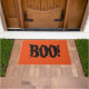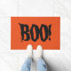 Halloween doormat shown with a spooky Boo! print on a orange background.