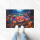 A black doormat with a large jack-o-lantern and autumn leaves. The doormat is decorated with a Happy Halloween message.