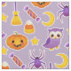 Beautiful halloween purple fabric with pumpkins, candy, broom, stars, spiders and owls.