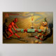 A beautiful vintage poster featuring a devil and a pumpkin character trying to open a firecracker.