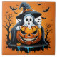 Halloween ghost with pumpkin under a spooky sky ceramic tile
