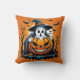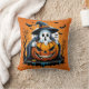 A playful ghost in a witch's hat clutches a carved pumpkin, surrounded by bats against an eerie orange backdrop, capturing the spirit of Halloween.