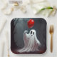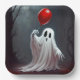 A ghostly figure holds a bright red balloon in a dark, eerie forest with twisted trees