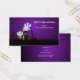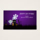 A spooky fun business card template with a halloween greeting. Creepy cute halloween design. Set in a dark and scary graveyard. A gravestone says RIP, with a candle and some glowing skulls on the ground. An old creaky fence leans off to the side. An adorable smiling skeleton is waving and some cool looking ghosts are swirling around in the air. Set on a black and purple gradient background.