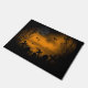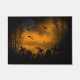 Halloween graveyard amidst a spooky tree in the chill of the orange night sky, moon lit. Bats flying around the tombstones and crosses. www.giftideas505.com