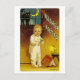 Vintage Halloween greeting card illustration showing a Victorian child frightened by a black cat at the window.