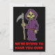 Halloween Grim Reaper Cartoon Party Invitation for adults or kids. The text reads "We're Dying To Have You Over." It's great for any Halloween party! Get your guests into the party mood with this cartoon grim reaper invite!