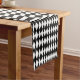 This table runner is shown in a black and white Halloween harlequin diamond print design.