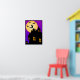 Halloween Haunted House Poster features a huge full moon complete with flying witch and bats, haunted house with eerie lit wondows and a RIP tombstone.