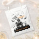 Trick or Treat take one if you dare, is a haunted Halloween quest for cute little trick or treaters on Halloween night. A spooky haunted house sits high on a hill surrounded by a creepy cemetery and circling bats. Cute and spooky Trick or Treat and Happy Halloween candy favour loot bags for a Halloween costume party.