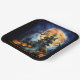 Halloween party square paper plates featuring a haunted house on a hill with scary glowing pumpkins in the foreground. The spooky atmosphere created by the dark night with moon, scary trees, house and the glowing pumpkins is the perfect way to set the tone for a Halloween party. This Halloween illustration is made in ai art watercolor and pencil.