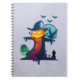 A notebook with a cool halloween illustration. Set on a grey lavender grunge background. A large haunted scarecrow, looking evil with a jack-o-lantern pumpkin head, wearing a witches hat. He has a menacing grin wearing tattered robes and is standing in a graveyard with a crow screeching on his arm. Bats flying off in the distance, a full moon in the background and a lone owl with glowing eyes sits on a tombstone.