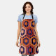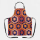 This apron has a geometric design of hexagons in four shades of orange on a field of black and purple stripes.
