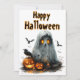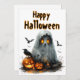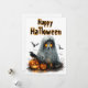 Channeling classic gothic vibes with a hint of playful fright, this design features a wide-eyed ghost in a ragged sheet, glowing from within as it floats alongside two carved jack-o’-lanterns. A vigilant black crow perches ominously on the largest pumpkin, adding a dash of mystery. Against a backdrop of fluttering bats, scattered autumn leaves, and a fiery "Happy Halloween" header dripping like candle wax, the scene evokes eerie delight. Perfect for greeting cards, party invites, or Halloween merchandise aimed at those who enjoy their spooky season with bold visuals and timeless charm.