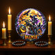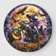 This image is a decorative wall clock with a vibrant and spooky Halloween theme. The clock face features a witch with purple hair riding a motorcycle, accompanied by a black cat on the back seat. The front wheel of the motorcycle is a glowing jack-o'-lantern. In the background, a large, yellow full moon is surrounded by flying bats and crows. The clock's numbers are scattered around the border, and the phrase "HALLOWEEN IS COMING" is prominently displayed at the bottom. The overall colour scheme is a mix of purples, oranges, and blacks, creating a festive and spooky atmosphere.