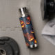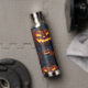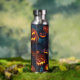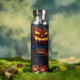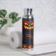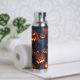 This beverage bottle features a fun Halloween pattern of grinning and glowing Jack o' Lanterns. The images are placed on a dark blue/black background.