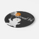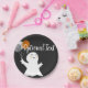 Cute little ghost holds Halloween colours balloons to greet and welcome trick-or-treating visitors.