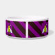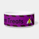 This awesome dog bowl features a cute little yellow bee wizard with black stripes. The Bee has big shiny black eyes and cute little black antennae. The wings of the bee are folded back to look like a cape. The bee is wearing a tall black hat with orange and purple stars on it. It is also holding a magic wand that is star shaped and sparkles with lots of different colours.