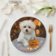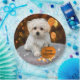 Happy Halloween, adorable maltese puppy, colourful celebration Halloween balloons in orange and yellow. Party time!