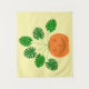 This awesome tapestry features a digital art image of a series of leaves from a houseplant called a Monstera, also known as the Swiss Cheese Plant. The leaves are dark green and lobed and some have holes in them. The plant is contained inside a scary orange looking Halloween pumpkin with a wicked grin, sharp teeth and evil eyes.