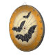 This dart board has a dark orange background with the moon in the centre and three bats flying in front of the moon.