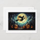 A witch on a broomstick flies across a full moon in a dark, eerie forest. Jack-o'-lanterns with sinister grins illuminate the ground below, enhancing the spooky atmosphere.