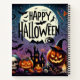 Celebrate a "Happy Halloween" with this incredibly detailed and vibrant design, packed with all the beloved elements of the holiday. Featuring a grinning jack-o'-lantern wearing a witch's hat, an array of smaller pumpkins, flickering candles, skulls, a spooky haunted castle, and a ghostly figure, all set against a large full moon with flying bats. This rich design captures the ultimate festive and frightful spirit of Halloween night, perfect for any product.