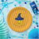 Halloween paper plates features orange sparkly stripes, kid-friendly pumpkin wearing a blue witch hat filled with sparkly white stars and blue bats flying.