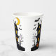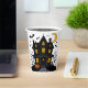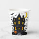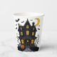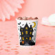 A Halloween themed paper cup featuring a spooky house with pumpkins, bats and a yellow moon. Perfect for Halloween parties, decorations and drinks.