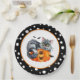 Halloween party paper plate is shown in a black and white polka dots design with a cat on a pumpkin print.