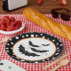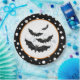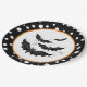 Halloween party paper plate is shown in a black and white polka dots design with a bats print.