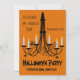 A party invitation suitable for a Halloween themed party featuring a spooky bat and cobweb chandelier with a black and orange theme. This invitation is fully customisable to include your own personal details.