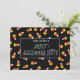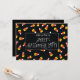 Who is in for a sweet Halloween party? All those who love candy say “I”! Candy corn is scattered throughout the black background. Add your party celebration details on the inside.