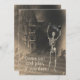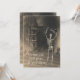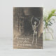 On this Halloween invitation with vintage atmosphere, a run-down old mansion can be glimpsed in the background, with some crows (or are they ravens?) flying past. In the foreground, a skeleton holds a black violin above his grinning skull, beckoning the recipient to "Come out and play, if you dare", and a fragment of music manuscript is just faintly visible. On the back, modify the text to suit the specifics of your event.