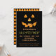 Halloween party invitation featuring an orange pumpkin jack o' lantern face on a dramatic black background. On the other side of the card there is a black and orange chequered pattern.