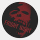 Creepy red demon skull face on black background for a "fright night" theme invitation envelope seal or sticker for treat bags. For your creepiest Halloween Party.