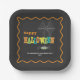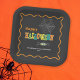 These Halloween Party paper plates offers a fun design featuring bright coloured typography on black. The design is accented with a cute spider and web.