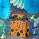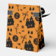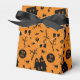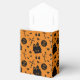 A Halloween trick or treat favour box for those candies and chocolates! It has many Halloween elements which include silhouettes of cats, bats, trees, tombstones, owls, withered trees, jack-o-lantern carved pumpkins and eerie looking possibly haunted houses. Text reads Trick or Treat. A colour palette of black and orange with bits of white.
