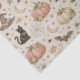 A soft, romantic Halloween repeating pattern with a gentle cottagecore and vintage watercolor feel. Blush and cream pumpkins adorned with delicate flowers are scattered among sweet black cats, crescent moons, fluttering bats, fine spiderwebs, tiny spiders, and twinkling stars. The muted pastel palette—featuring blush pinks, warm ivory, sage green, and soft charcoal—creates an elegant, whimsical mood that feels cozy and refined rather than spooky.