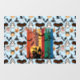 This whimsical Halloween-themed pattern bursts with festive elements. A black cat with a mischievous grin sits atop a spiderweb, while a witch's hat casts a shadowy presence. A trio of grinning pumpkins, with their glowing eyes and toothy smiles, add a touch of spooky charm. A friendly ghost, dressed in a cowboy hat and bandanna, brandishes two toy guns, adding a playful touch. The pattern is completed with a scattering of candy canes, bats, and other Halloween icons, all rendered in a playful and lighthearted style. The background features a subtle grey pattern, reminiscent of cobwebs, providing the perfect backdrop for this festive ensemble.