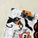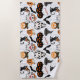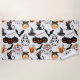 This whimsical Halloween-themed pattern bursts with festive elements. A black cat with a mischievous grin sits atop a spiderweb, while a witch's hat casts a shadowy presence. A trio of grinning pumpkins, with their glowing eyes and toothy smiles, add a touch of spooky charm. A friendly ghost, dressed in a cowboy hat and bandanna, brandishes two toy guns, adding a playful touch. The pattern is completed with a scattering of candy canes, bats, and other Halloween icons, all rendered in a playful and lighthearted style. The background features a subtle grey pattern, reminiscent of cobwebs, providing the perfect backdrop for this festive ensemble.