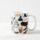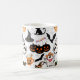 This whimsical Halloween-themed pattern bursts with festive elements. A black cat with a mischievous grin sits atop a spiderweb, while a witch's hat casts a shadowy presence. A trio of grinning pumpkins, with their glowing eyes and toothy smiles, add a touch of spooky charm. A friendly ghost, dressed in a cowboy hat and bandanna, brandishes two toy guns, adding a playful touch. The pattern is completed with a scattering of candy canes, bats, and other Halloween icons, all rendered in a playful and lighthearted style. The background features a subtle grey pattern, reminiscent of cobwebs, providing the perfect backdrop for this festive ensemble.