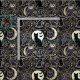 The image is a digital graphic designed as a detailed, repeating pattern or background, heavily themed around Halloween and witchcraft. It features numerous intricately drawn elements in shades of black, white, and purple against a dark background. Prominent elements include black cats, witch hats adorned with stars and buckles, owls perched on crescent moons, bats flying against a full moon, spiderwebs, stars, swirls, and other mystical symbols. The overall style is detailed and evocative, suggesting themes of magic, spells, and the spooky season.