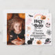 Pink, black and orange hey boo birthday invitation featuring a pink ghost, orange pumpkins, witches hat, black cat, rainbow and more. This retro style Halloween birthday invitation is ideal for a Halloween themed first birthday but could be used for any age.