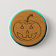 A round, wooden button featuring a carved pumpkin jack-o'-lantern design with a glowing blue outline.