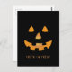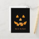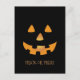 Halloween postcard featuring an orange grinning pumpkin jack o' lantern face and the lettering "Trick or treat" on a dramatic black background.