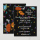 Halloween Invitation Featuring a Black Sky, Crescent Moon, Colourful Saturn, Clouds and more colourful stars abound. Cute Pumpkin Family standing next to a tree with orange fall colour Leaves and a Big BOO! With eyes atop the letters all inviting you to a most but not too spooky Halloween Harvest Party. Perfect for the Church Harvest Halloween Party too!