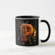 A halloween funny pumpkin jack-o'-lantern in the shape of the letter "P" holding a lamp with a flame.